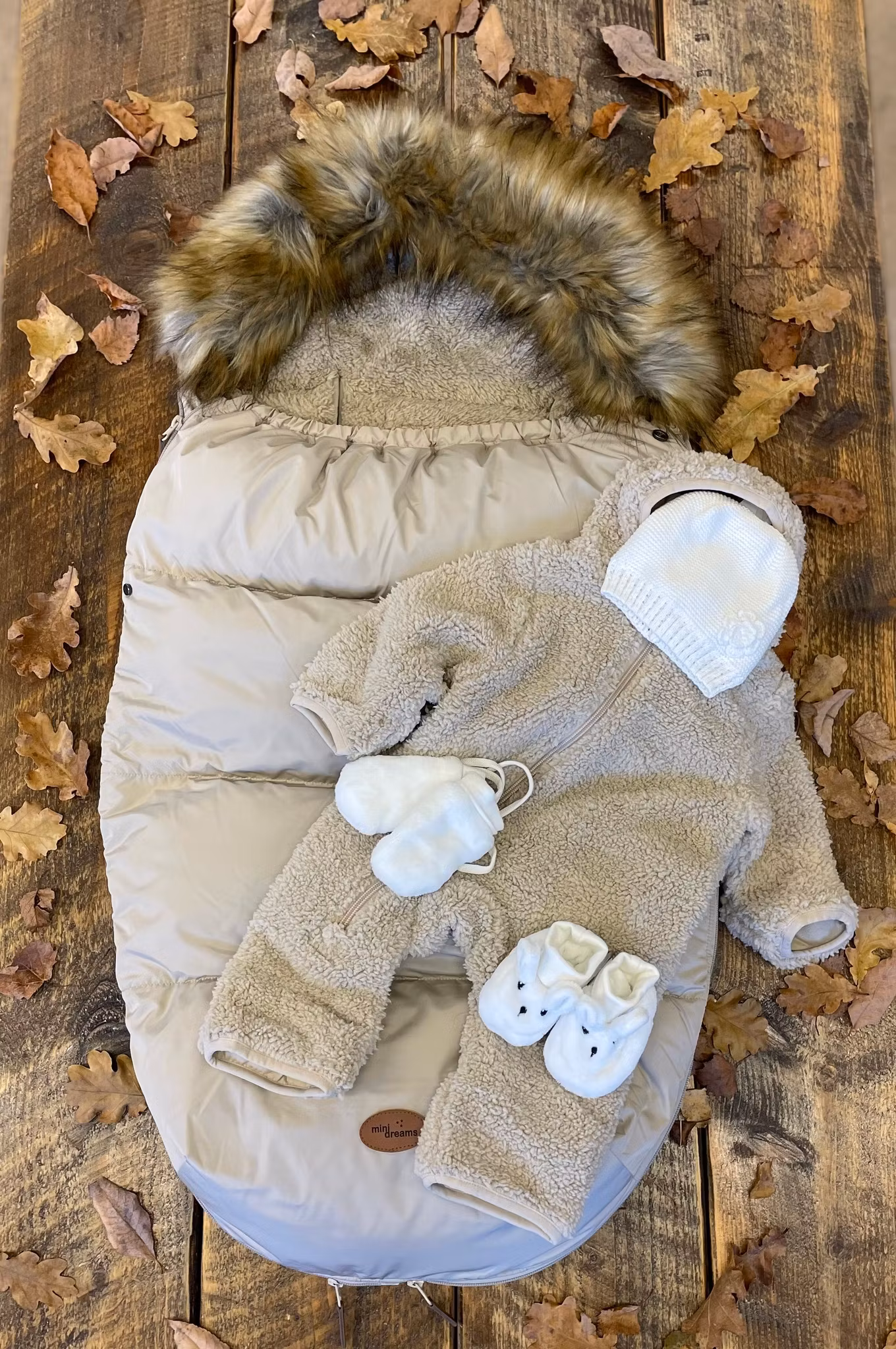 En varm och mysig åkpåse med ett mjukt teddy foder. Åkpåsen har en fin fuskpäls längst upp och överdelen kan avlägsnas tack vare en dragkedja som går runt hela