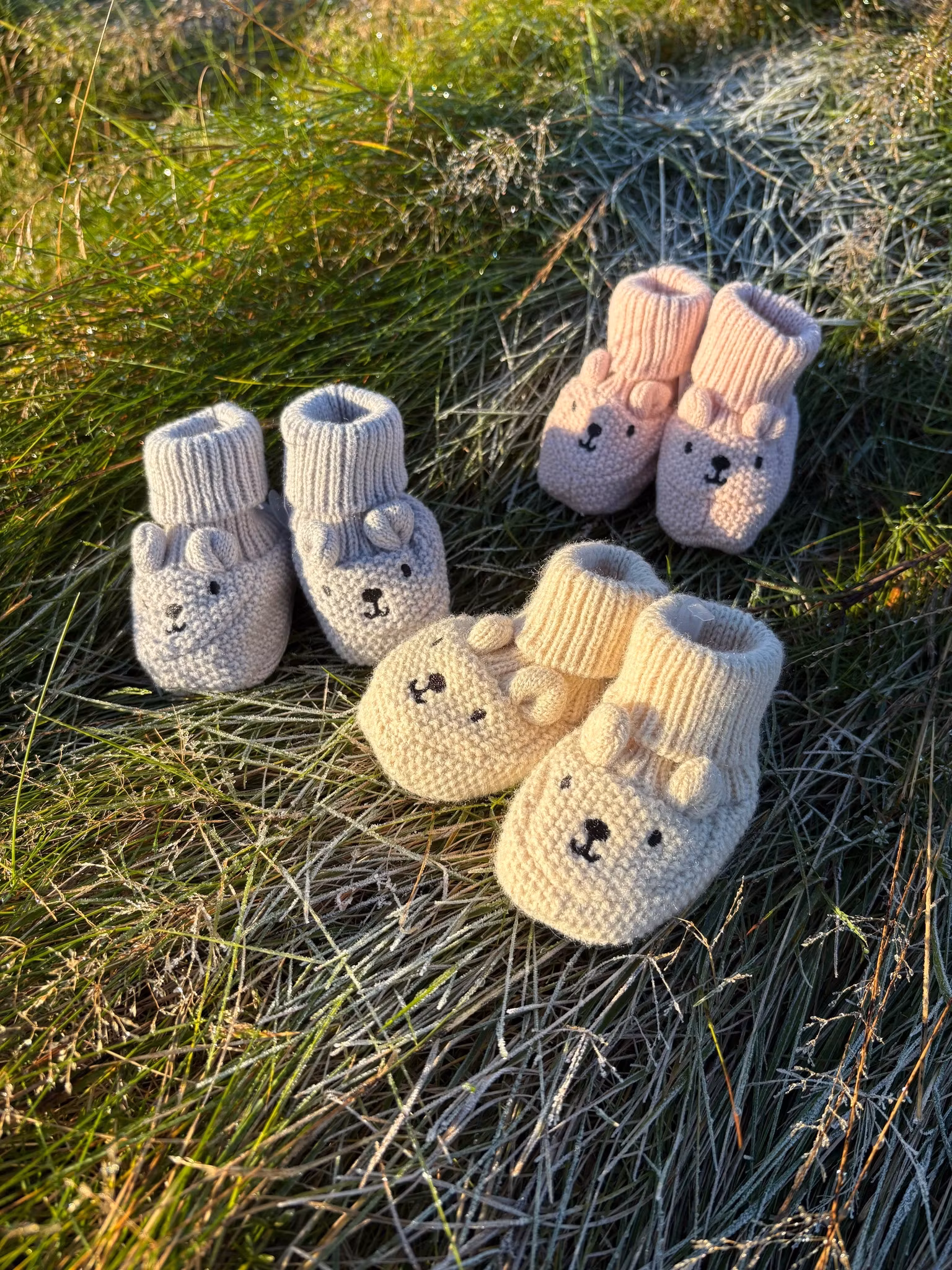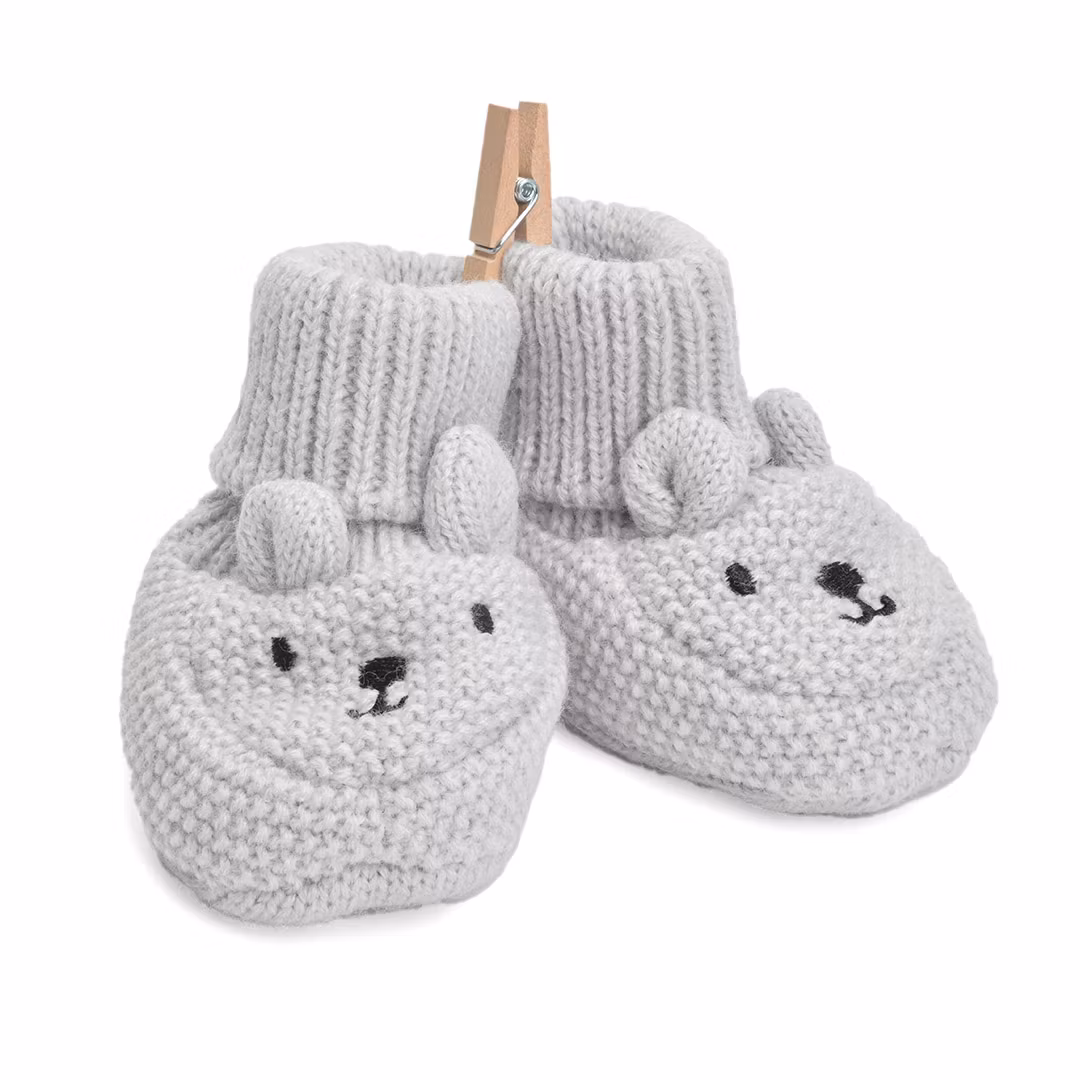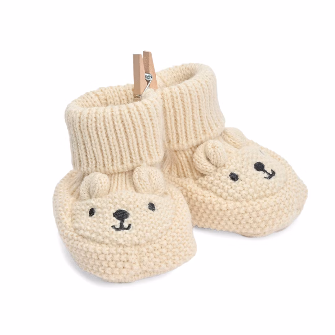 Våra nya supersöta babytossor med öron och nalle brodyr.Varm med fleecefoder och stickad utsida.Tossorna är i one size ca 0-6 mån.Tvätt 40 grMaterial utsida: 10